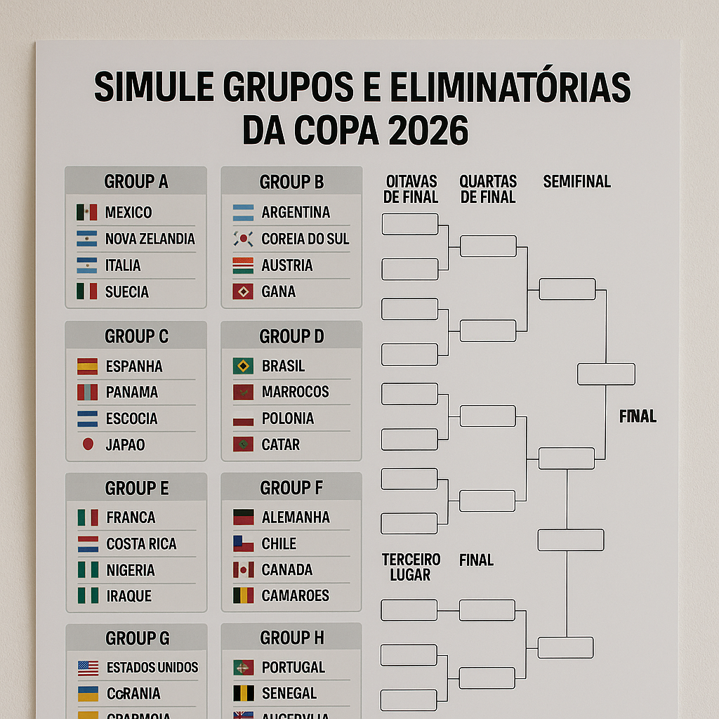 O primeiro passo para simular grupos e eliminatórias da Copa 2026 é organizar as 48 seleções em 12 grupos equilibrados. A FIFA utiliza critérios específicos para distribuição dos times, considerando ranking mundial, histórico de desempenho e equilíbrio competitivo. Você pode começar separando as seleções em potes de acordo com sua força atual no futebol internacional.